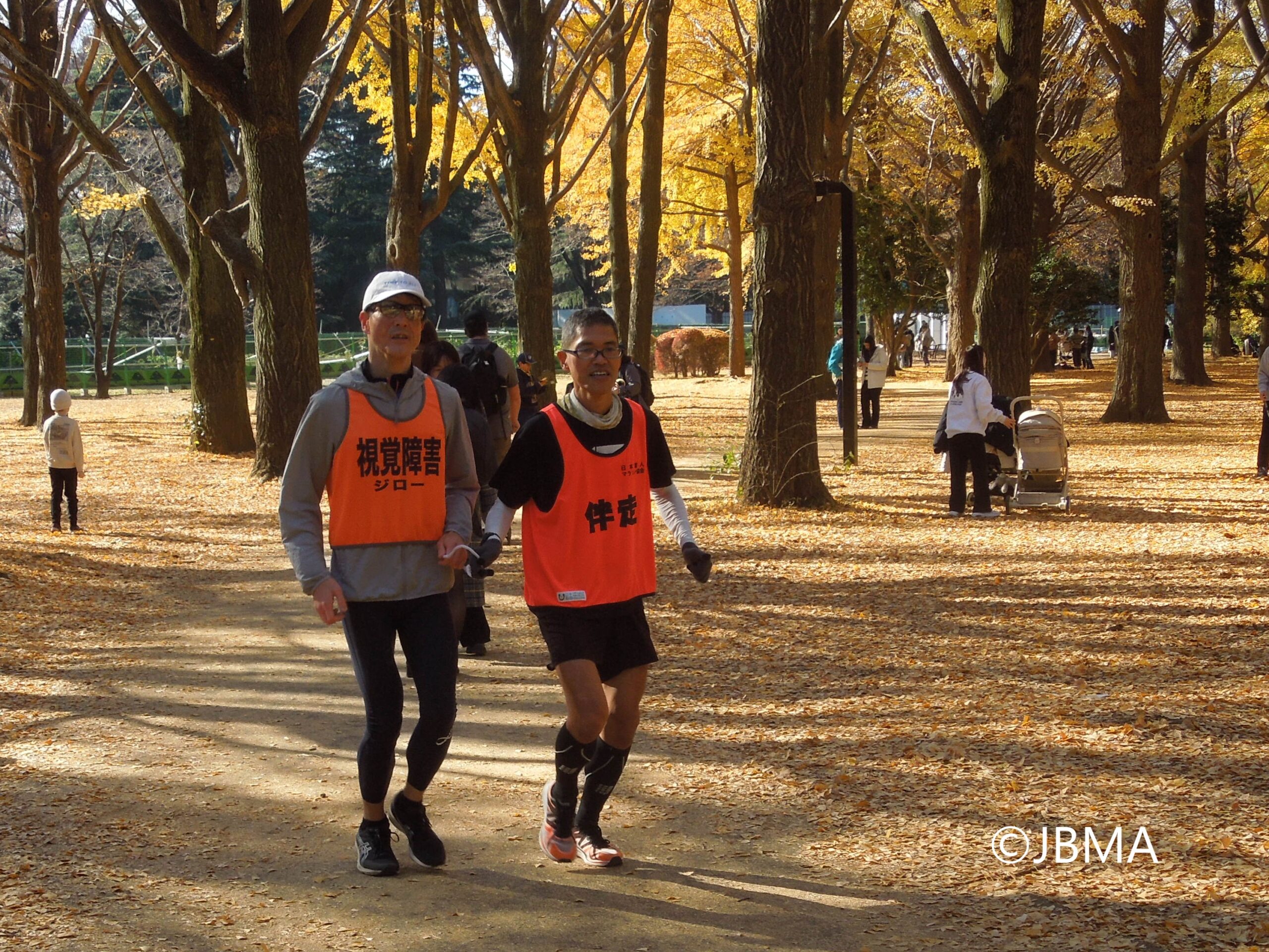 代々木公園は晩秋の紅葉見物の方も多く来園しており、伴走者さんは細心の注意を払って安全な誘導を心掛けていました。