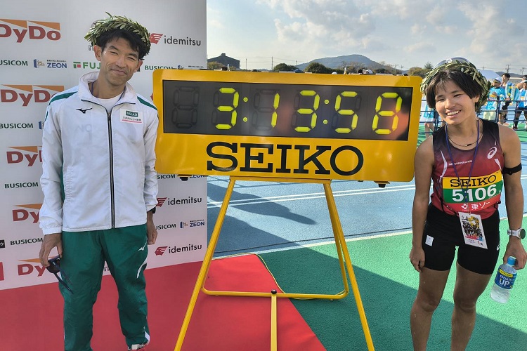 画像:男女の優勝者 熊谷選手と和木選手。中央のタイマーは和木選手の優勝記録3時間13分58秒を表記